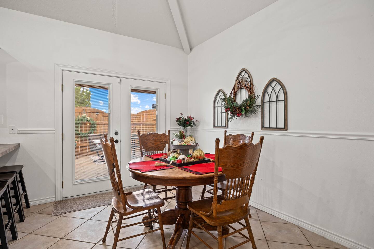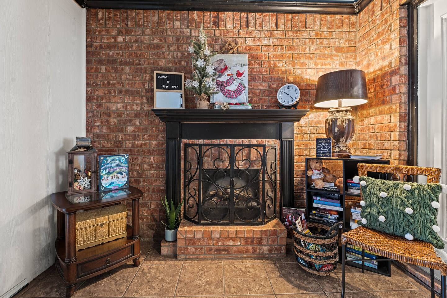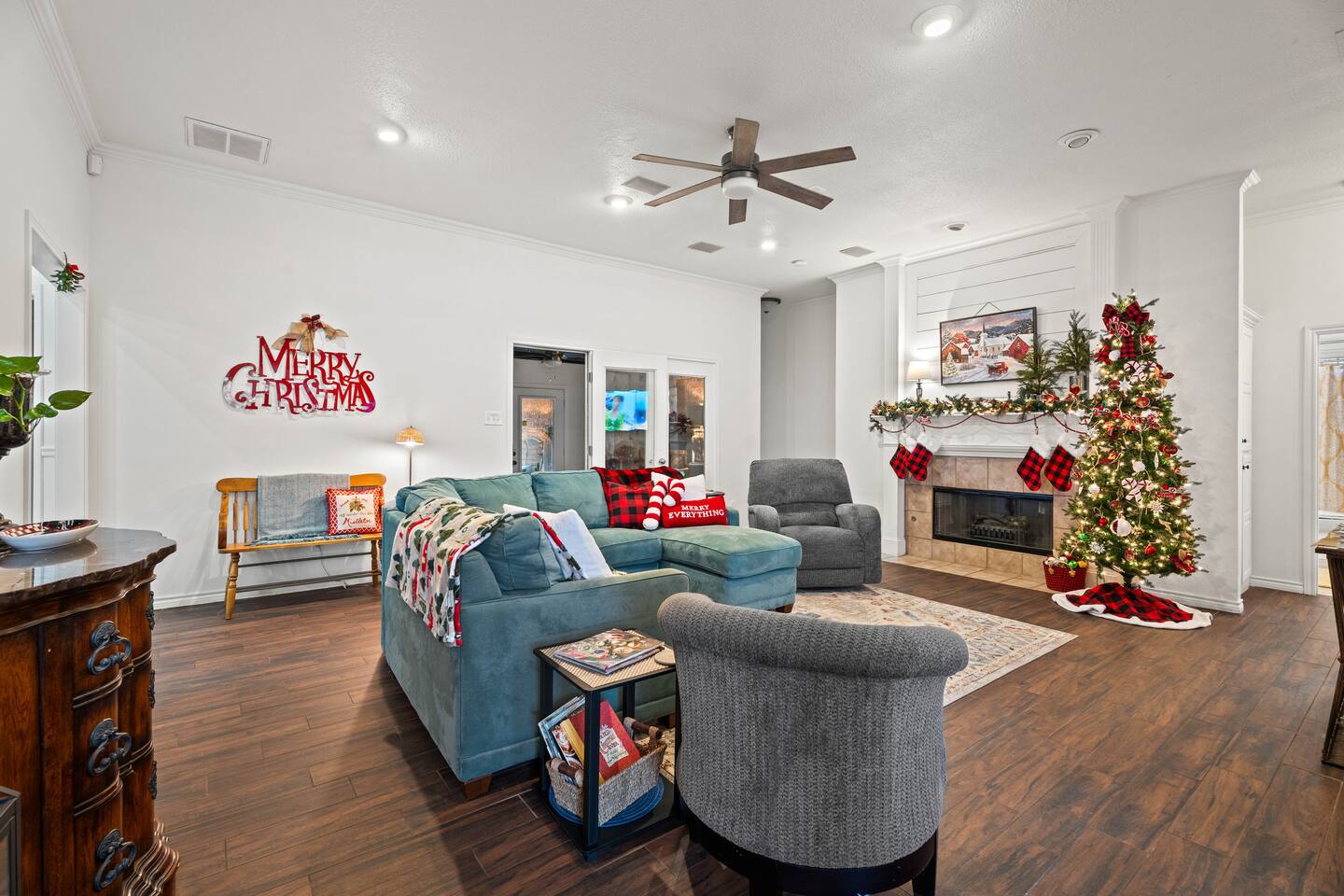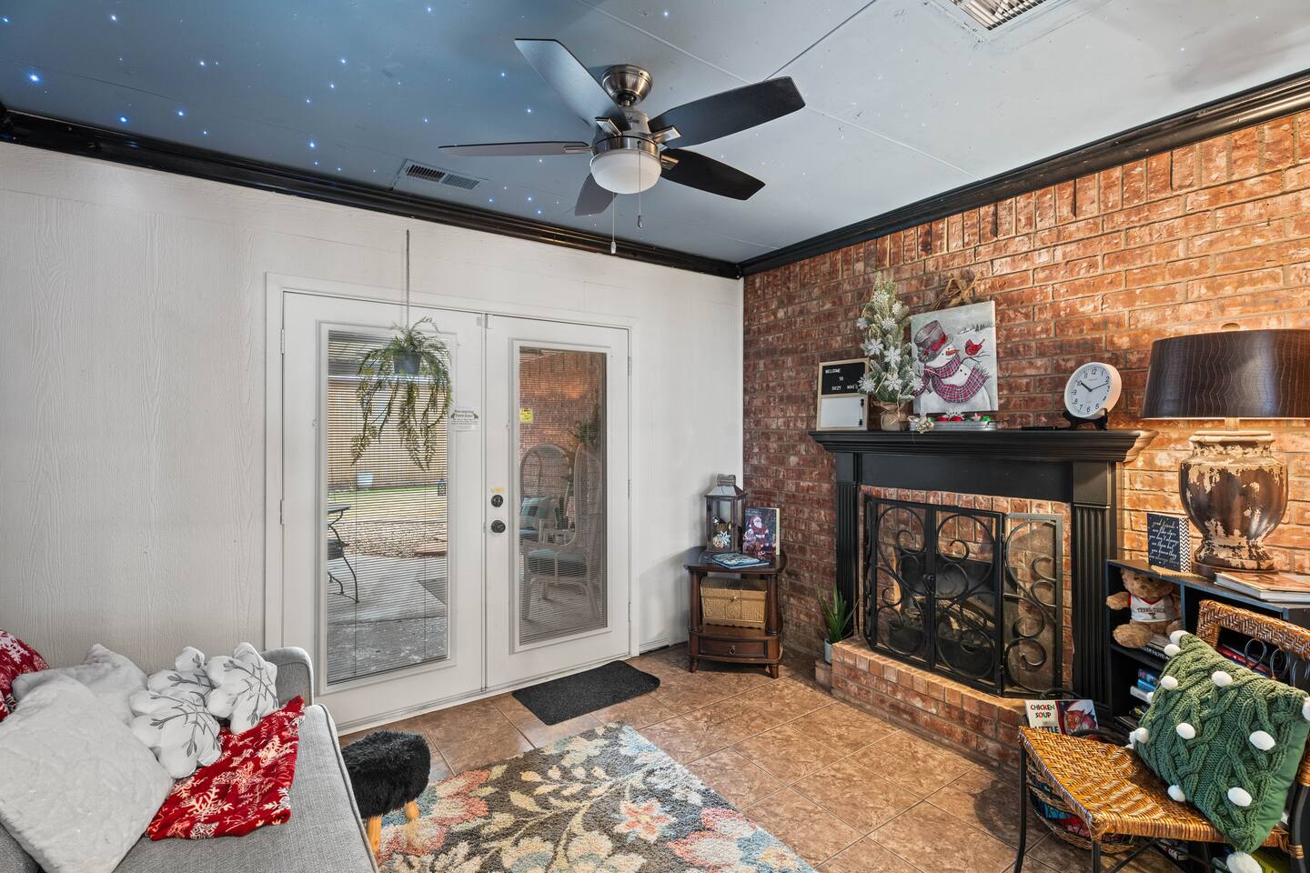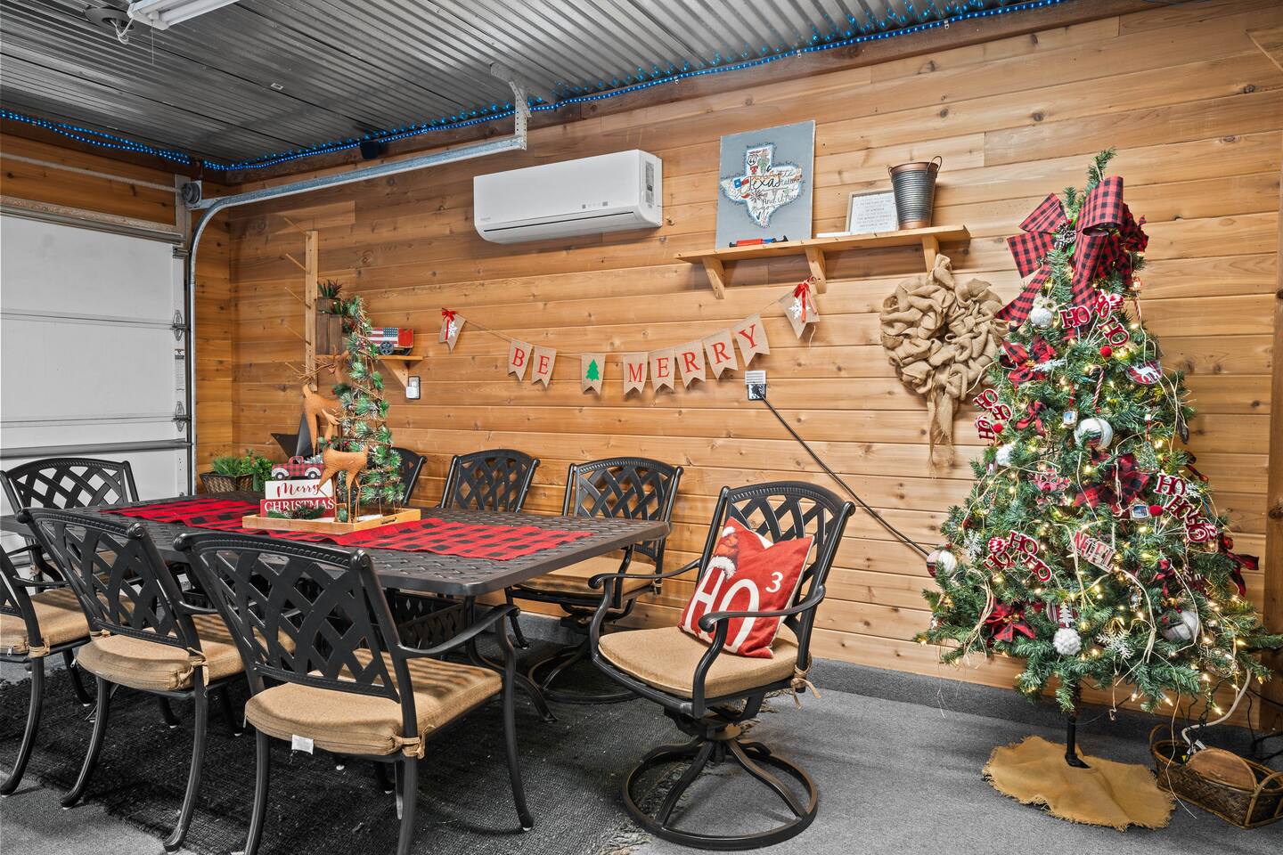 You'll feel completely transported the moment you walk in the door. It's luxurious with a rustic twist, and fully decorated for Christmas starting Nov. 1st! It's cozy, renovated, furnished & designed to meet all your needs. Enjoy a completely stocked kitchen that includes Keurig & coffee pot. There is a breakfast area, bar & formal dining area to seat 13 people. Enjoy a home cooked meal, take out or have it delivered. The living area offers a 58 inch Smart TV, fireplace & comfy sofa ready for your lounging needs. There is also an enclosed patio waiting for you to relax and star gaze....the ceiling is totally covered with stars that light up for you to escape and meditate. This room has a pull out twin size sofa bed. The oversized & isolated master bedroom suite has a king sized bed. The luxurious master bathroom offers a shower & large Jacuzzi bath to help ease the tensions from the busy day. Has 2 vanity areas + a sit down vanity. There is also a large walk in closet. There are 2 more bedrooms with queen size beds & a guest bath with a shower bath combo & 2 vanity areas. The home offers a laundry room with a washer /dryer. The carpeted and air conditioned garage is the perfect area to watch the big game on the 60 inch TV & play ping pong. Saving the best for last....OUT ON THE PATIO! The rustic pergola covered patio is sure to please everyone who gathers here. You will feel slower paced in this busy life we all live. It's a beautiful space to get fresh air, listen to birds sing, lounge, dine al fresco & converse with family & friends. Suzy Mae's is Christian owned and operated and we cannot wait to host YOU!