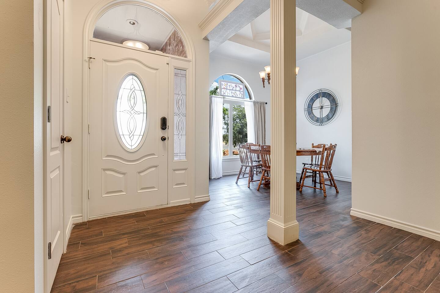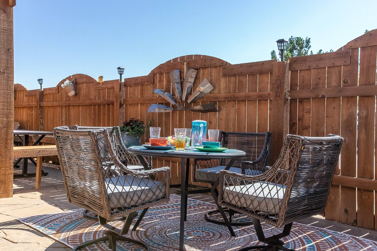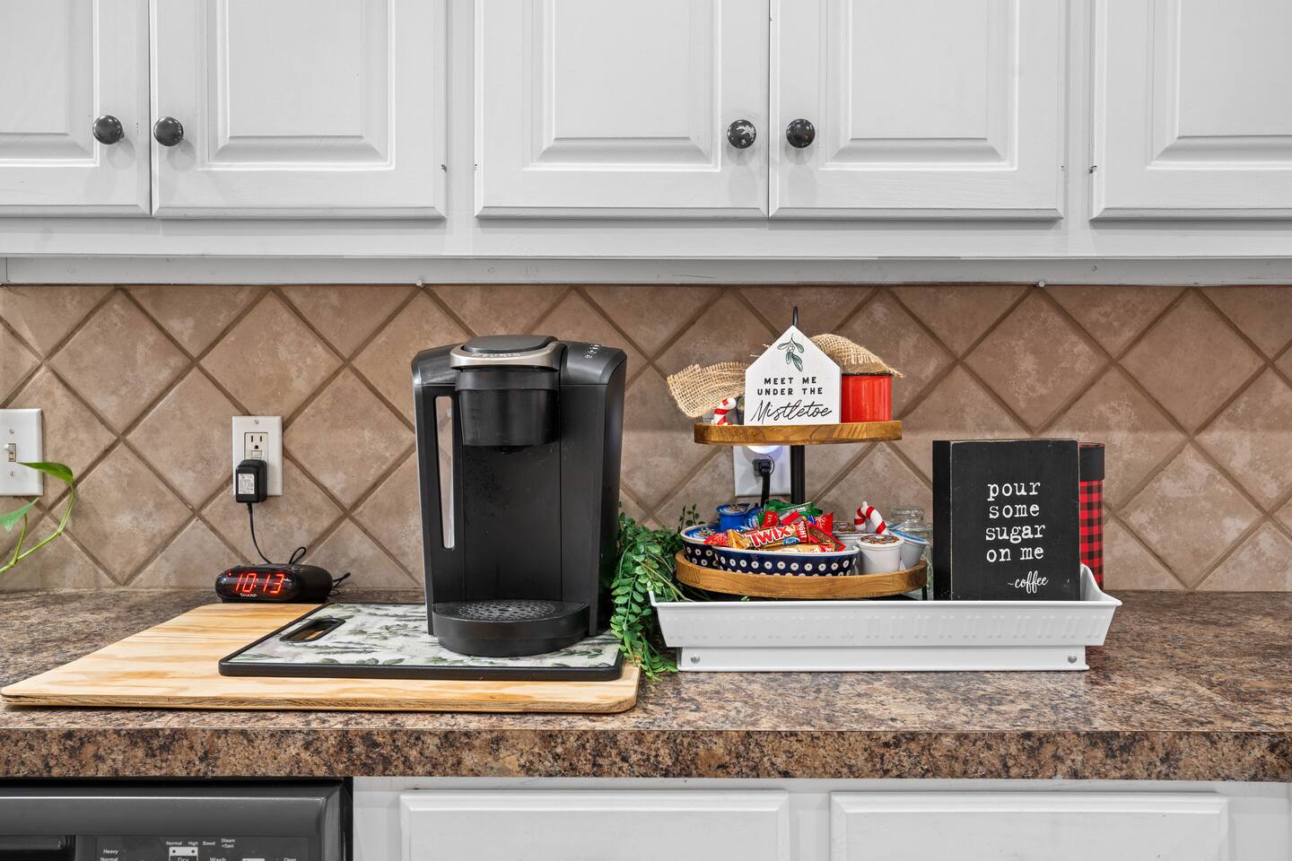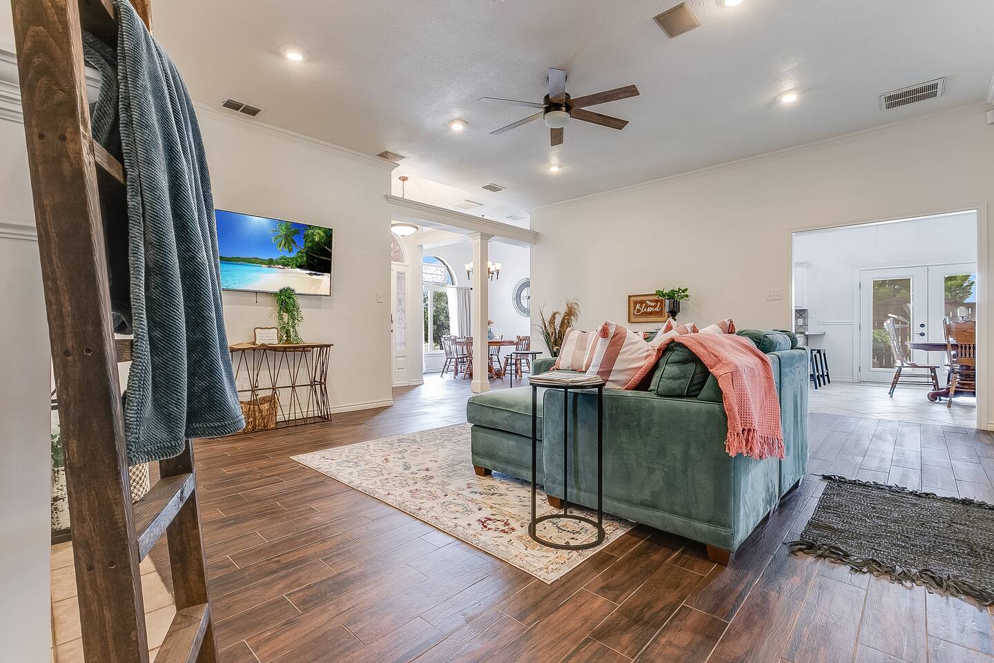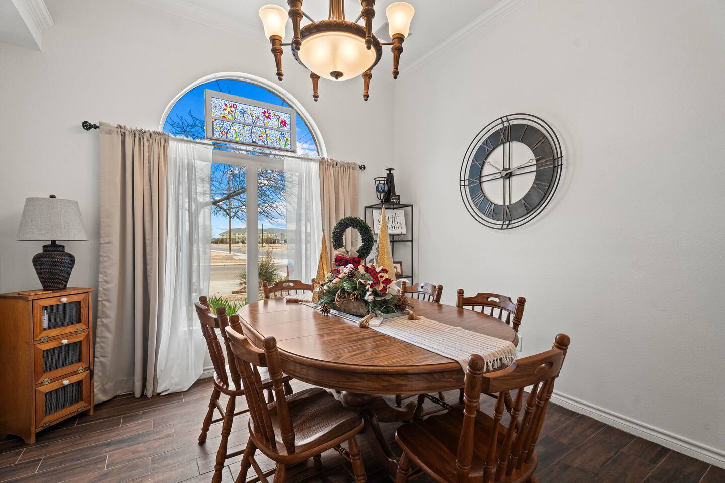 You'll feel completely transported the moment you walk in the door. It's luxurious with a rustic twist, and fully decorated for Christmas starting Nov. 1st! It's cozy, renovated, furnished & designed to meet all your needs. Enjoy a completely stocked kitchen that includes Keurig & coffee pot. There is a breakfast area, bar & formal dining area to seat 13 people. Enjoy a home cooked meal, take out or have it delivered. The living area offers a 58 inch Smart TV, fireplace & comfy sofa ready for your lounging needs. There is also an enclosed patio waiting for you to relax and star gaze....the ceiling is totally covered with stars that light up for you to escape and meditate. This room has a pull out twin size sofa bed. The oversized & isolated master bedroom suite has a king sized bed. The luxurious master bathroom offers a shower & large Jacuzzi bath to help ease the tensions from the busy day. Has 2 vanity areas + a sit down vanity. There is also a large walk in closet. There are 2 more bedrooms with queen size beds & a guest bath with a shower bath combo & 2 vanity areas. The home offers a laundry room with a washer /dryer. The carpeted and air conditioned garage is the perfect area to watch the big game on the 60 inch TV & play ping pong. Saving the best for last....OUT ON THE PATIO! The rustic pergola covered patio is sure to please everyone who gathers here. You will feel slower paced in this busy life we all live. It's a beautiful space to get fresh air, listen to birds sing, lounge, dine al fresco & converse with family & friends. Suzy Mae's is Christian owned and operated and we cannot wait to host YOU!