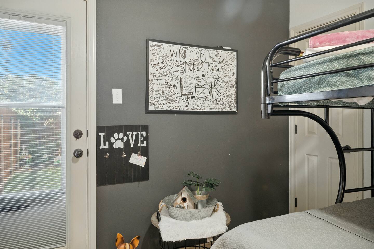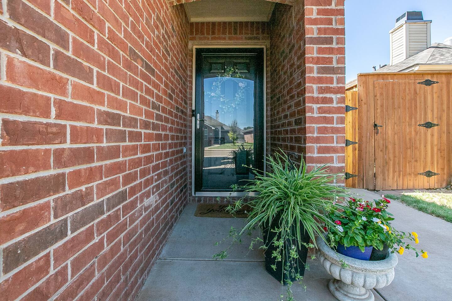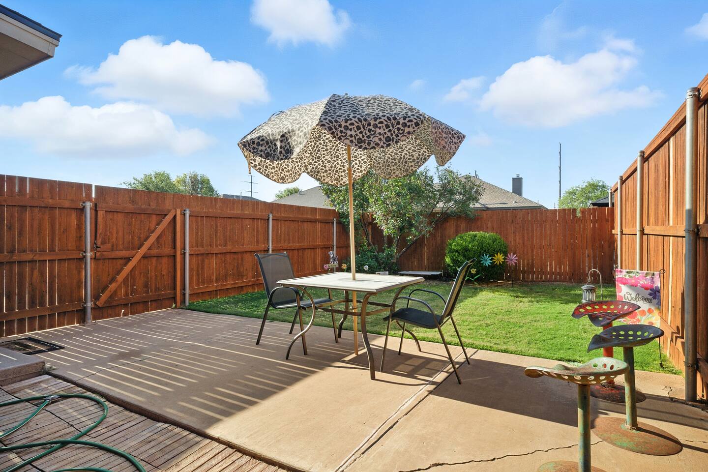 The space includes an open living & stocked kitchen including Keurig & coffee pot. Enjoy leather reclining sofas, smart TV and unlimited WIFI. The master bedroom is isolated and has a king size bed and smart TV. The master bathroom contains a luxury bathtub for soaking after a long hard day as well as a separate shower. There are 2 more bedrooms and a guest bath. One bedroom contains a queen bed and desk / work station. The 3rd bedroom has a comfy futon sofa / twin bunk bed. This garden home can comfortably sleep 6 to 7 guests. The utility room includes a washer / dryer and there is a 2 car rear entry garage available. The backyard & side patio are ideal for enjoying a morning cup of coffee & evening Chilton with the West Texas sunset. It's the perfect spot for your furry friends to stretch & fetch.